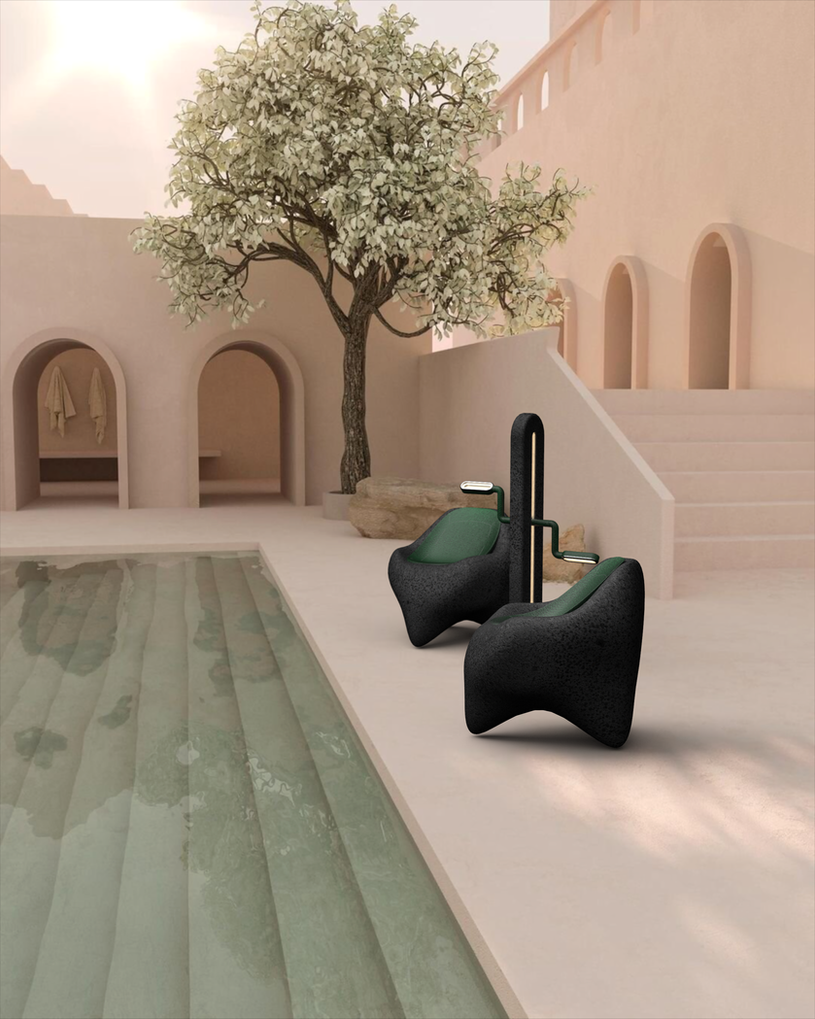 "Una fusión natural y contemporánea: La silla, esculpida en basalto como los molcajetes, abraza con suavidad el cuero de cactus. Su complemento, una lámpara en forma de cactus abstracto, emerge majestuosa sobre una columna de basalto. La luz baila entre su estructura de aluminio, envuelta en la suavidad del cuero."